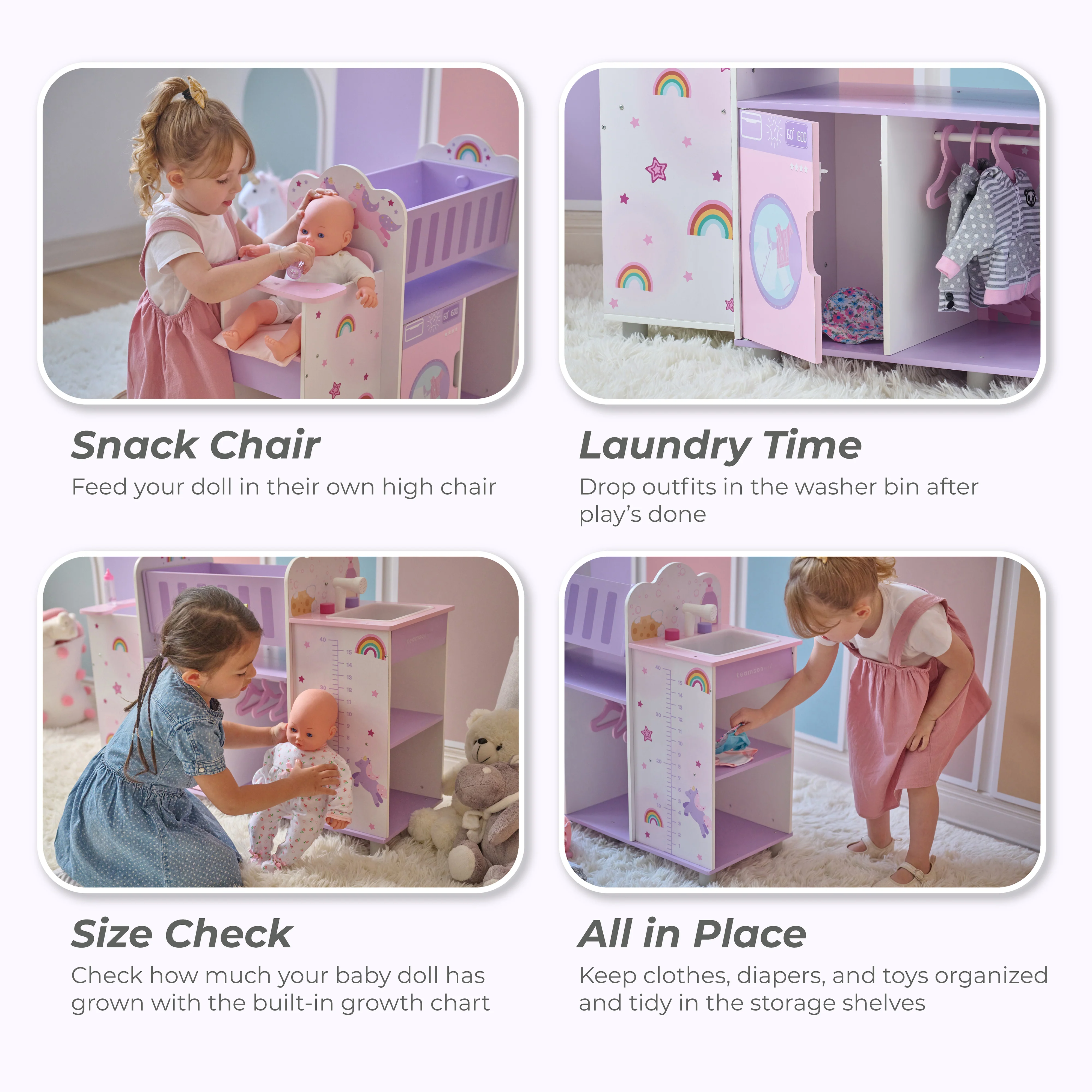 This 6-in-1 baby doll care station teaches empathy, order and offers clutter free play with a cradle, sink, high chair, washing machine, closet and a growth chart. A smart and space-saving toy for kids 3+ who love nurturing routines like mom.